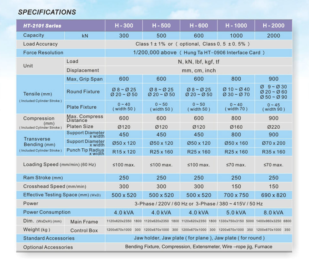 Conforming to many international standards like ASTM E4, ASTM E8-04, GB/T 232-2010, GB/T 7314-2005, ISO 7500-1-2004, DIN 5122, GB/T 16826-2008, GB/T 228-2010, JJG139-1999, JIS Z22410-1998, EN1002-2, JIS B7721 / B 7733, ISO-6892-1 2009 (E), CNS 9471 / 9470.