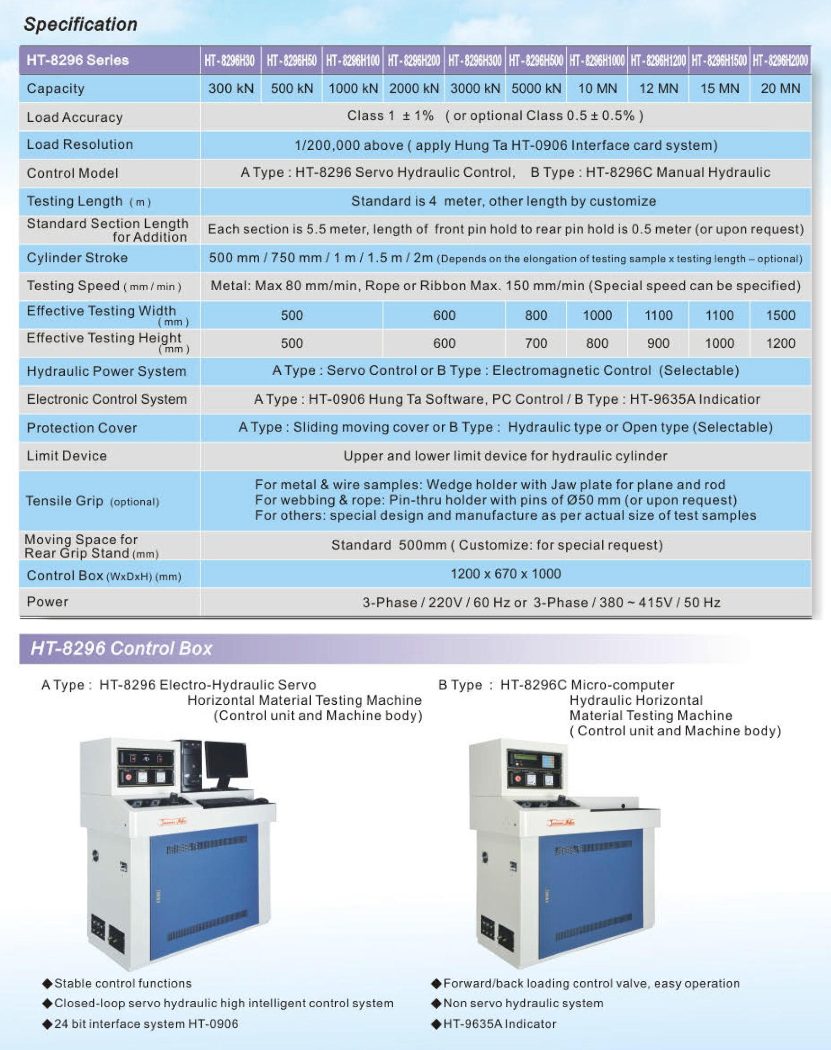 - Suitable for testing longer specimens like wire, cable, connecting rod, steel wire, steel cable, steel link, metal chain, chain assembly, spring, webbing, rope, anchor chain, hook, piping, metal fasteners…etc.