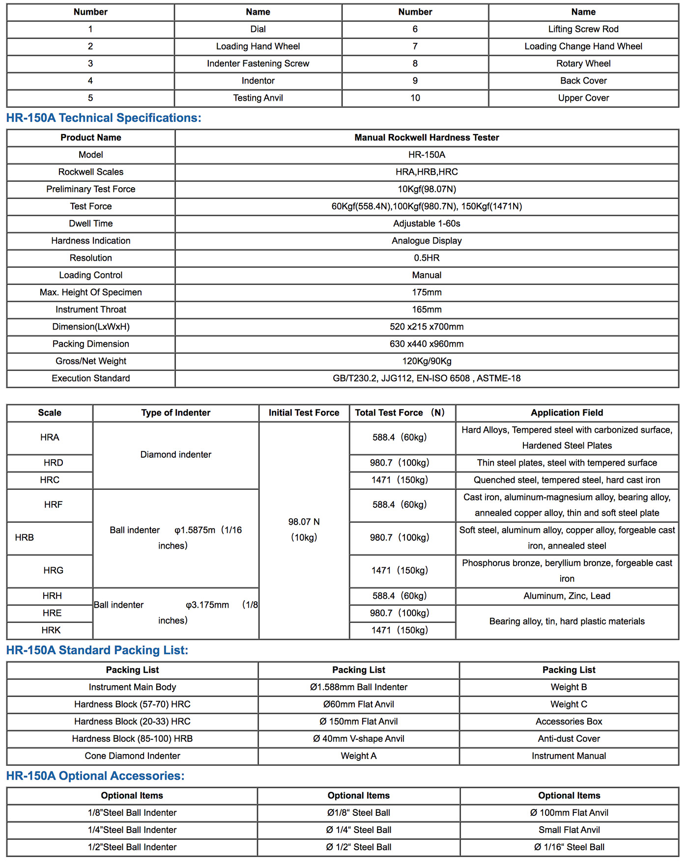 - HR-150A is an effective manual Rockwell testing machine with high accuracy, reliability and durability, it is applied at the workshops and measurement departments for determining the Rockwell hardness of the ferrous and non-ferrous metals.